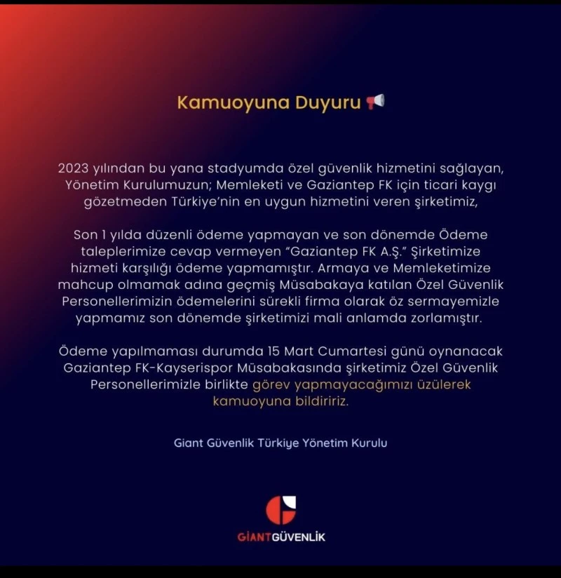 Şirket, kulüpten alacaklarını tahsil edemediğini ve çalışanların maaşlarını kendi öz sermayesiyle ödediğini belirterek, bu durumun mali açıdan zorlayıcı hale geldiğini vurguladı. Ödeme yapılmaması halinde, 15 Mart Cumartesi günü oynanacak Gaziantep FK-Kayserispor karşılaşmasında güvenlik hizmeti vermeyeceklerini açıkladı.