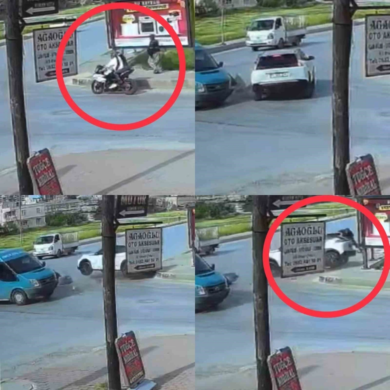 Feci kaza çevrede bulunan bir güvenlik kamerasına saniye saniye yansıdı. Görüntülerde iki aracın çarpışmasıyla savrulan otomobilin yayaya çarpma anları yer aldı. Görüntülerde kazadan saniyeler öncesinde ise aynı noktadan dönen 2 kişinin olduğu motosikletin de son anda kurtulması dikkat çekti.