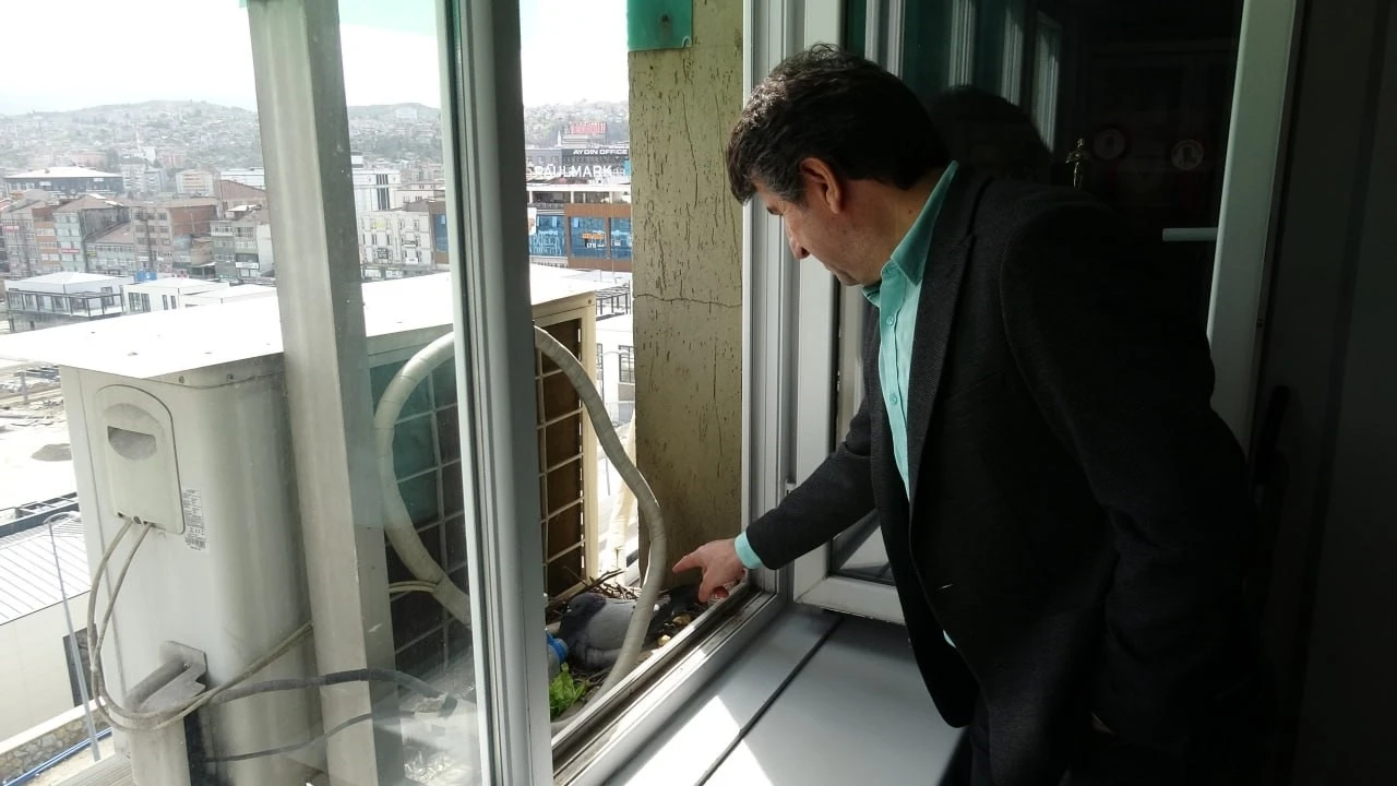 Kent merkezinde bir iş hanının 4’üncü katındaki ofisine gelen inşaat mühendisi Yusuf Aydın, pencere kenarında hareket eden iki yabani güvercini fark etti. Pencereyi açan Aydın, güvercinlerin klima motoruna yuva yaptığını gördü. Güvercinlerin yumurtlayacaklarını fark eden Aydın yuvayı çalı çırpı ile sağlamlaştırıp yuvayı genişletti. Güvercinlere marul, karnabahar gibi yiyecekler temin etmeye başladığını anlatan Aydın, "Güvercinlerin küçük odun parçaları taşıdığını gördüm. Yuva yapma gayretleri vardı. Biraz daha çalı çırpı toplayıp yuvalarını büyüttüm. Yumurtlayacakları belliydi ve birkaç gün sonra 2 tane yumurta yaptılar. Yavrular dünyaya gelirse buradan düşme ihtimalleri düşüncesiyle yuvayı büyüttük. Yemini, suyunu, marulunu, karnabaharını koymaya başladık. Artık yerinden hiç kalkmıyor. Tamamen yavrularına odaklanmış. Hatta bazen yiyecek koyacağımız zaman kızıyor, müdahale ediyor" dedi.