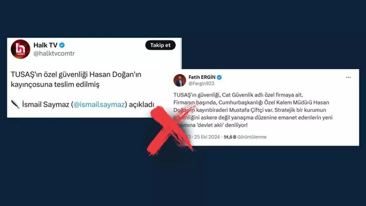 Dezenformasyonla Mücadele Merkezi'nden yapılan açıklamada, "Bazı basın yayın organlarında yer alan ve sosyal medya hesaplarında paylaşılan, "TUSAŞ'ın güvenliği Hasan Doğan'ın kayınbiraderine teslim edilmiş" iddiası doğru değildir. Cumhurbaşkanlığı Özel Kalem Müdürü Hasan Doğan'ın akrabası olarak bahsi geçen Mustafa Çiftçi'nin, ilgili özel güvenlik firmasına sahip olduğu veya yönetici olarak çalıştığı iddiası gerçek dışıdır. Mustafa Çiftçi, TUSAŞ Güvenlik Biriminde sözleşmeli olarak çalışan bir personeldir. Kişinin bu görevi dışında herhangi bir şirketle hiçbir düzeyde ilişkisi bulunmamaktadır. Kamuoyunu manipüle etmeye yönelik asılsız iddialara itibar etmeyiniz" denildi.