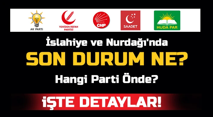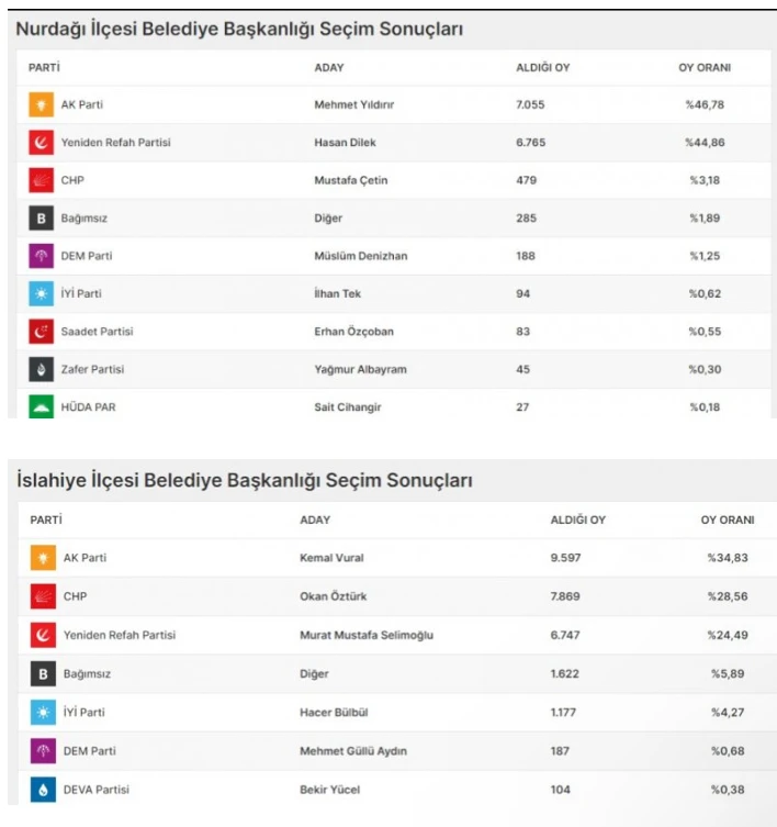 <div>Gaziantep'in İslahiye ve Nurdağı ilçelerinde AK Parti adayları seçimi önde götürüyor. İşte sonuçlar.</div> <div></div>