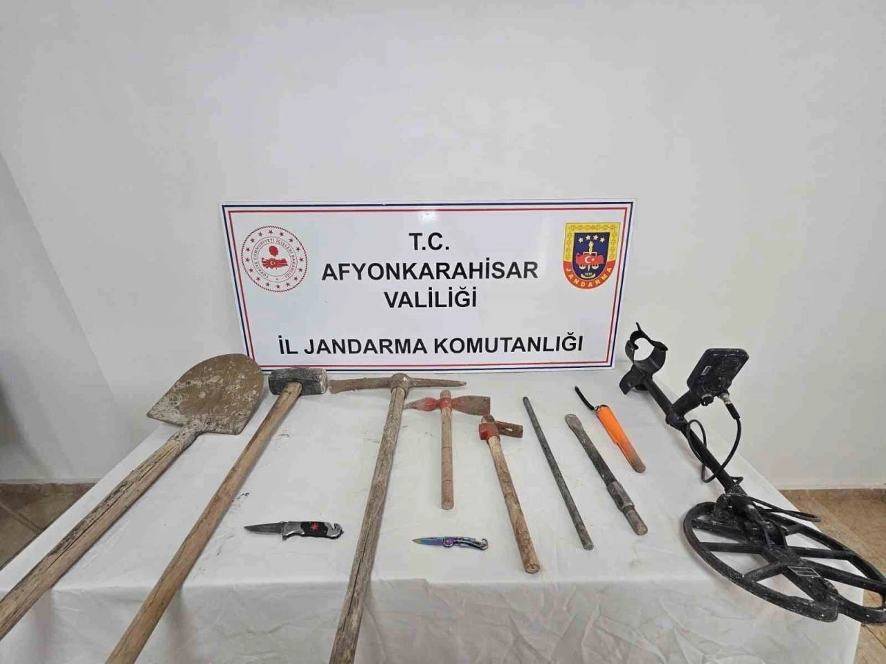 Afyonkarahisar’da izinsiz yaptıkları kazıyla define arayan 3 kişi jandarma tarafından suçüstü yakalandı.