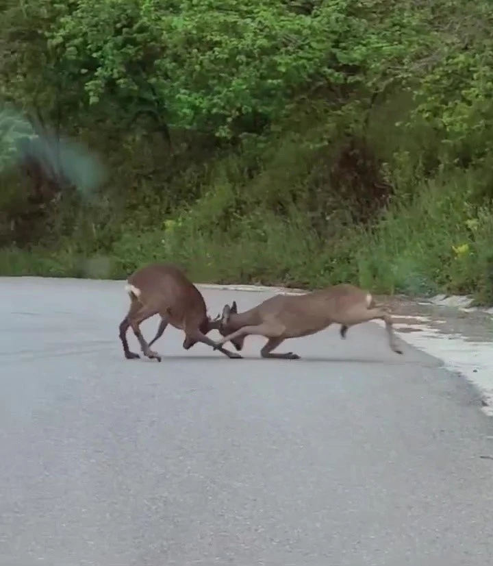 Cumayeri ilçesinin yüksek kesimlerinde seyreden aracın sürücüsü, yol üzerinde iki karacanın birbirlerine boynuzlarını vurararak saldırdığını fark etti. Hayvanları