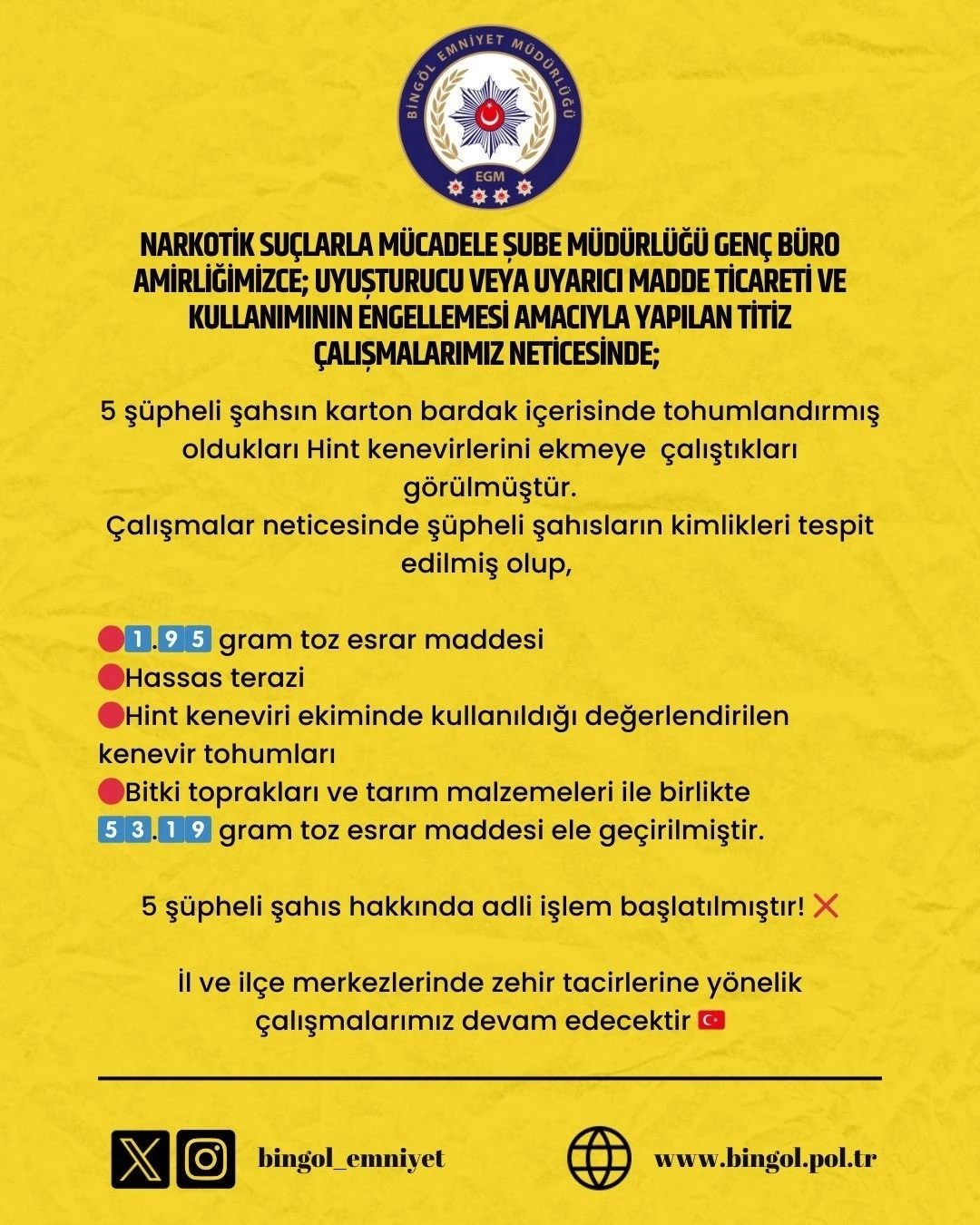 Bingöl Emniyet Müdürlüğü Narkotik Suçlarla Mücadele Şube Müdürlüğü Genç Büro Amirliğince uyuşturucu veya uyarıcı madde ticareti ve kullanımını engellemek amacıyla çalışma gerçekleştirdi. Çalışmalar neticesinde 5 şüpheli şahsın karton bardak içerisinde tohumlandırılmış oldukları Hint kenevirlerini ekmeye çalıştıkları belirlendi. Çalışmalar neticesinde şahısların kimlikleri tespit edildi. Operasyonda 1.95 gram toz esrar, hassas terazi, Hint keneviri ekiminde kullandıkları değerlendirilen kenevir tohumları, bitki toprakları ve tarım malzemeleri ile 53.19 gram toz esrar maddesi ele geçirildi. Yakalanan 5 şüpheli hakkında adli işlemlere başlandığı belirtildi.