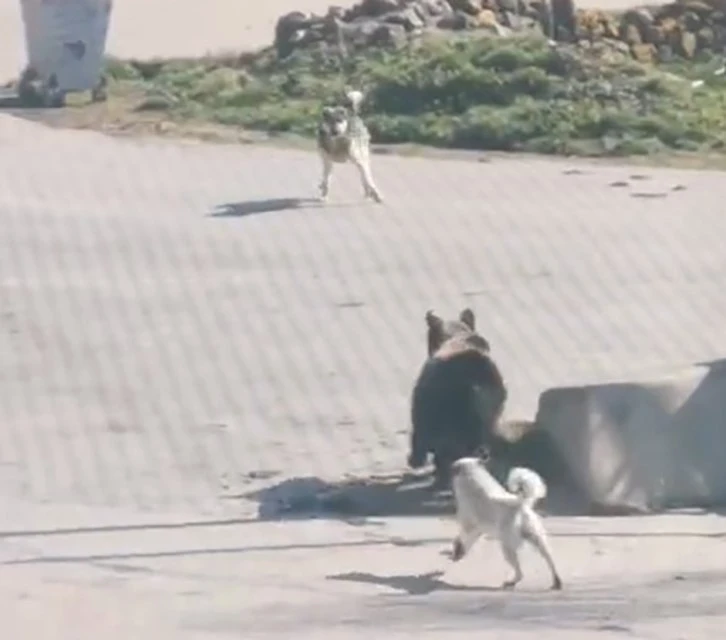 Çankırı’nın Orta ilçesine bağlı Hüyük köyünde kış uykusundan uyanan ayı yerleşim yerine inerek yiyecek aramaya başladı. O sırada ayıyı fark eden sokak köpeklerinin havlayarak tepki vermesi üzerine panikleyen ayı, korkarak bölgeden hızla uzaklaştı. O anlar ise vatandaşlar tarafından cep telefonuyla saniye saniye görüntülendi.
