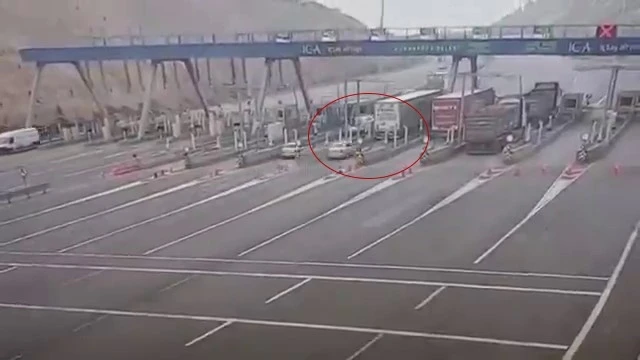 Görüntülerde, gişelerde duran tırın arkasından hızla gelen Hyundai marka otomobilin kontrolünü kaybederek tırın altına girdiği anlar yer alıyor.