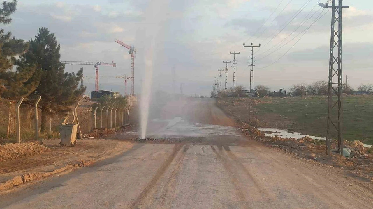 Malatya’da, patlayan borudan fışkıran su metrelerce yükseğe çıktı.