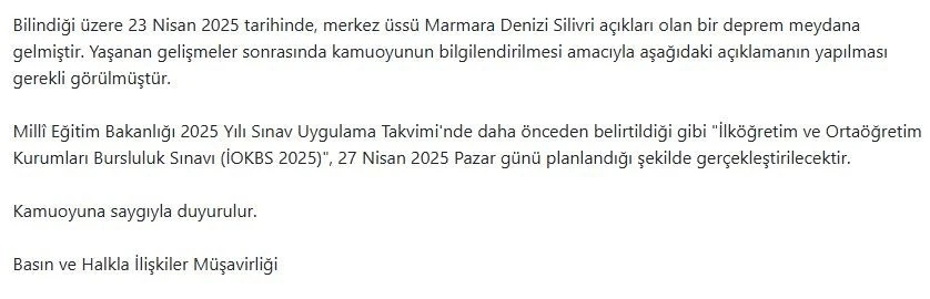 23 Nisan’da merkez üssü Marmara Denizi Silivri açıkları olan bir deprem meydana gelmişti. Yaşanan gelişmeler sonrasında kamuoyunun bilgilendirilmesi amacıyla MEB tarafından bir açıklama yapıldı. MEB’in açıklamasında, İOKBS 2025 sınavının ertelenmeyeceği ve belirlenen tarih olan 27 Nisan’da gerçekleşeceği ifade edildi.