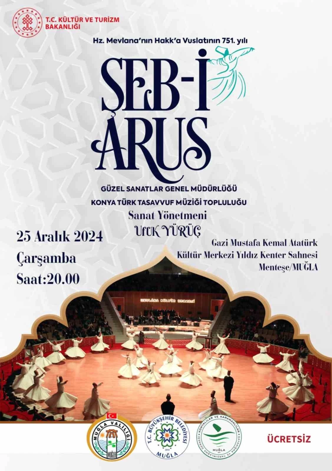 Konyalılar ve Karamanlılar Sosyal Yardımlaşma ve Dayanışma Kültür Derneği tarafından Muğla’da ilk defa Mevlâna’nın 751. Vuslat Yıldönümü Uluslararası Anma Törenleri (Şeb-i Arûs) etkinlikleri kapsamında 25 Aralık tarihinde Sema gösterisi düzenlenecek.