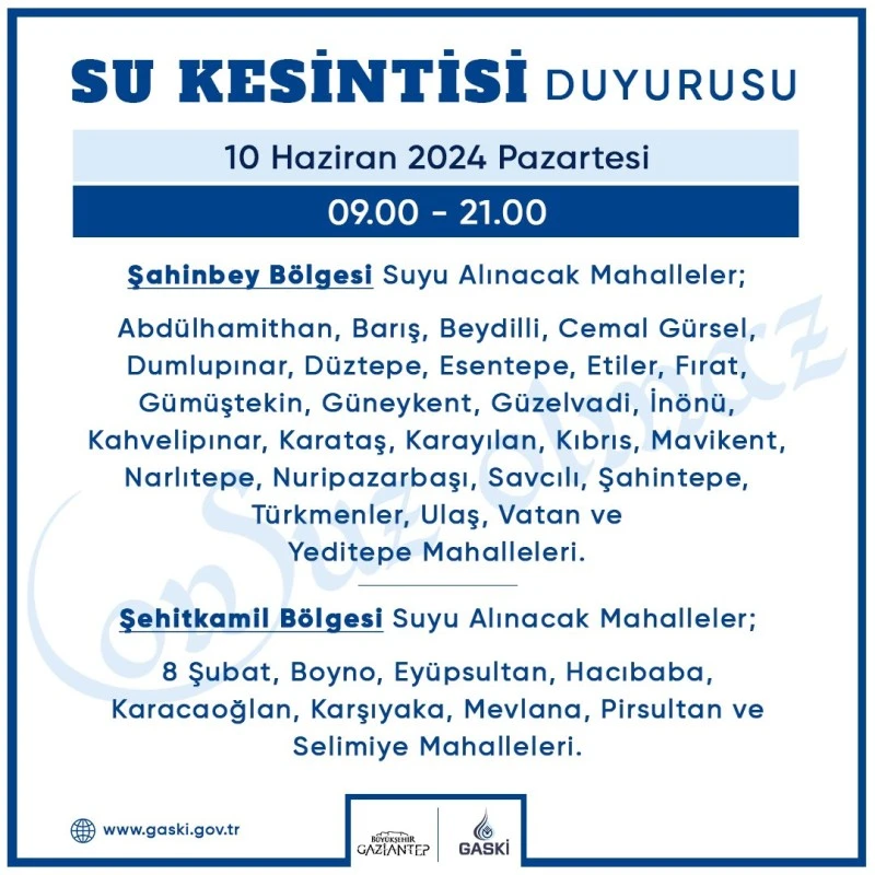 GASKİ’den yapılan açıklamada Gazşantep'in 35 mahallesinde su kesintisi uygulanacağı duyuruldu.