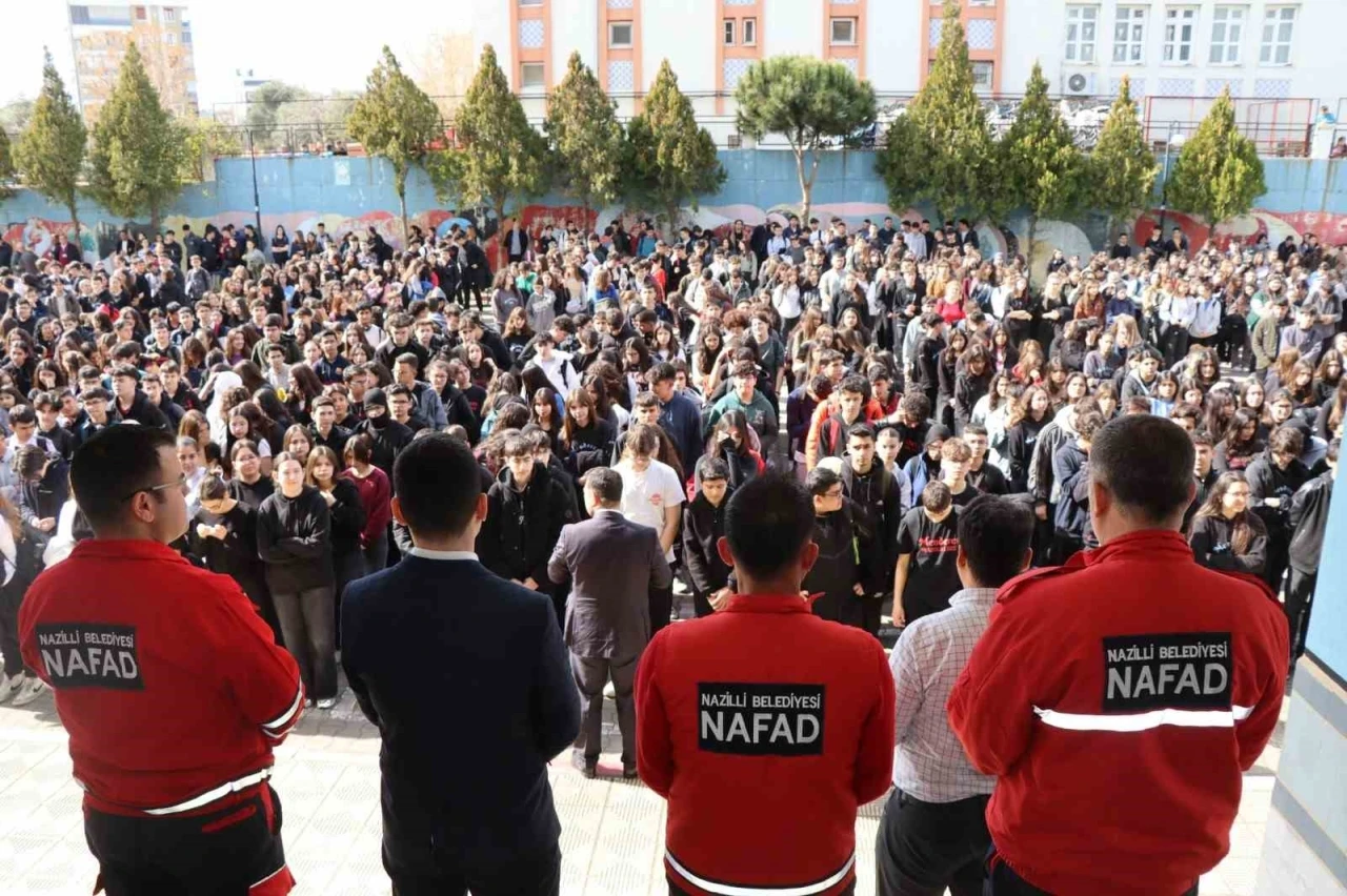 Nazilli Belediyesi Afet ve Acil Durum Ekibi (NAFAD), Deprem Haftası kapsamında ilçedeki 3 lisede Afet Farkındalık Eğitimleri düzenledi. Öğrencilere deprem öncesi, sırası ve sonrasında yapılması gerekenler anlatılırken, aynı zamanda uygulamalı eğitimlerle bilinçlendirme çalışmaları yapıldı. Nazilli Belediye Başkanı Dr. Ertuğrul Tetik; afetlere karşı bilinçli bireyler yetiştirmenin önemine vurgu yaparak; "Nazilli’miz birinci derece deprem bölgesinde yer alıyor. Bu nedenle vatandaşlarımızın afetlere karşı bilinçlenmesi hayati önem taşıyor. NAFAD ekibimizin gerçekleştirdiği eğitimlerle, gençlerimizi afetlere hazırlıklı hale getiriyor, onlara doğru müdahale yöntemlerini öğretiyoruz. Afetlere karşı bilinçli ve hazırlıklı bir toplum oluşturmak için çalışmalarımıza devam edeceğiz" sözlerini kaydetti. NAFAD eğitmenleri tarafından verilen eğitimlerde bölgemizdeki afet riskleri, yapısal olmayan tehlikeler, tehlike avı, çök, kapan, tutun gibi kritik konular ele alındı. Eğitim sonunda öğrencilere acil durum çantası hazırlama ve afet anında doğru hareket etme konularında da bilgiler verildi. Nazilli Belediyesi İnsan Kaynakları ve Eğitim Müdürü ve NAFAD ekibi lideri Yıldıray Topaloğlu; toplumun her kesimine ulaşarak afet bilincini artırmaya yönelik eğitim, tatbikat ve farkındalık çalışmalarını sürdüreceklerini belirterek desteklerinden dolayı Nazilli Belediye Başkanı Dr. Ertuğrul Tetik’e teşekkür etti.