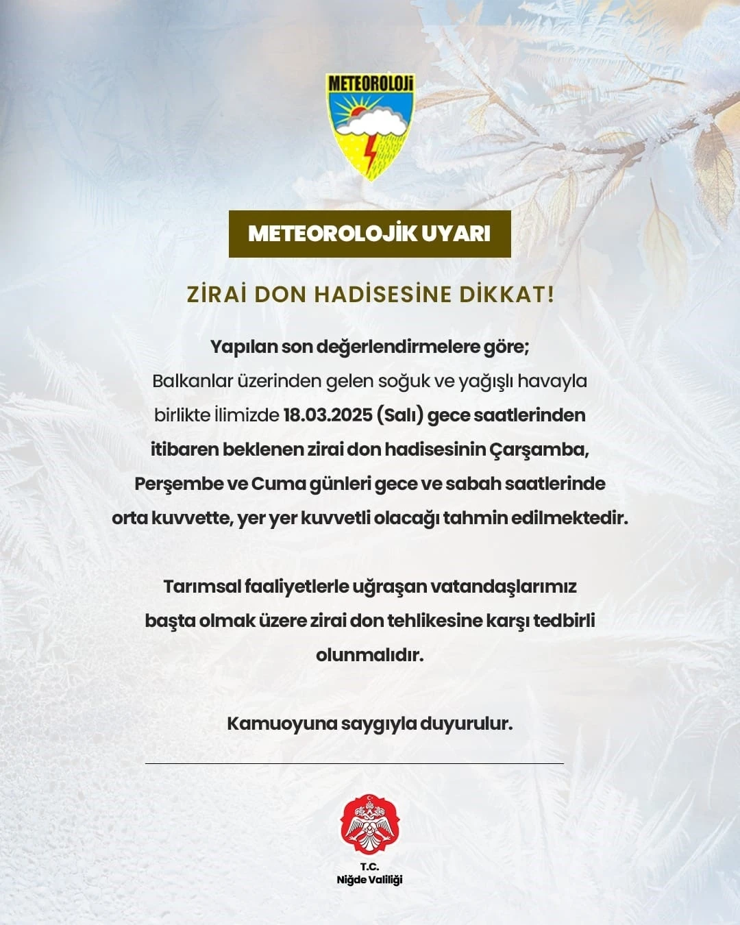 Niğde Valiliği, özellikle tarımsal faaliyetlerle uğraşan vatandaşları zirai don olayına karşı dikkatli ve tedbirli olmaları konusunda uyardı.