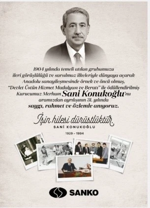 “Gaziantep ve Anadolu’nun sanayileşmesine önemli katkılar sunarak örnek ve öncü olan, öğretileri ve miras bıraktığı değerlerle her daim yolumuzu aydınlatan muhterem babam Sani Bey’i aramızdan ayrılışının 31’inci yıl dönümünde saygı, rahmet ve özlemle anıyorum.”