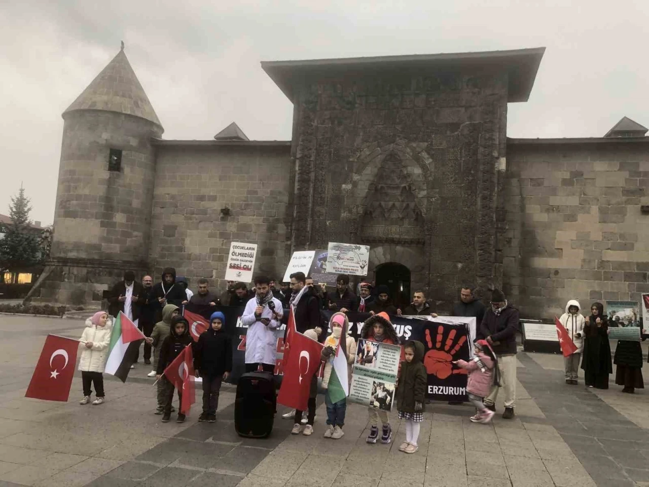 Erzurum Lala Mustafa Paşa Camii avlusunda toplanan sağlık çalışanları, taşıdıkları pankartlarla Yakutiye Medresesi’ne yürüyerek İsrail saldırılarını protesto etti, Filistin halkına destek verdi.