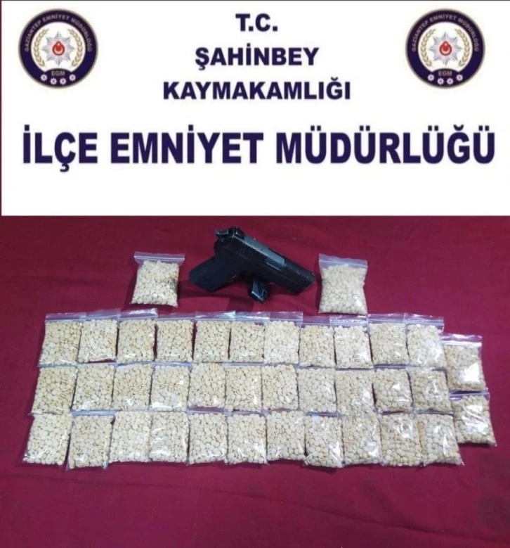 Gaziantep’in Şahinbey ilçesinde polis ekipleri tarafından düzenlenen operasyonda, 10 bin 900 adet uyuşturucu hap, 21 bin 700 lira para ve bir adet ruhsatsız tabanca ele geçirildi.