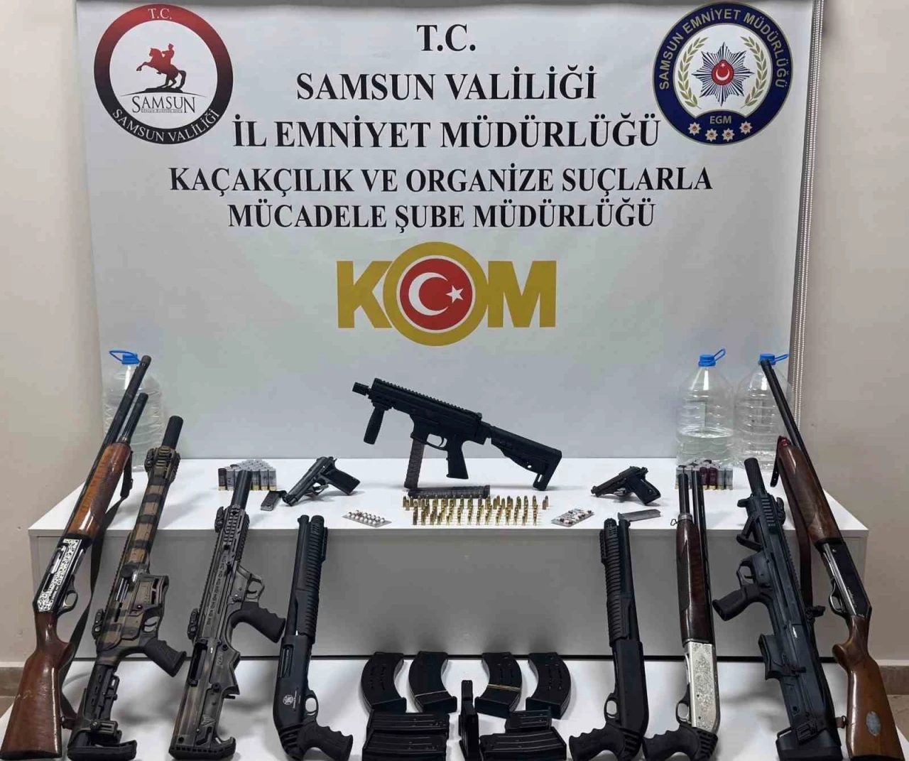 Samsun’un İlkadım ilçesinde, Emniyet Müdürlüğü Kaçakçılık ve Organize Suçlarla Mücadele (KOM), Asayiş Şube Müdürlüğü, Narkotik Suçlarla Mücadele Şube Müdürlüğü ve Göçmen Kaçakçılığıyla Mücadele Şube Müdürlükleri tarafından alkollü bir eğlence mekanına düzenlenen operasyonda adeta cephanelik ele geçirildi. Yapılan aramalarda, 1 adet ruhsatsız otomatik tabanca, 2 adet ruhsatsız tabanca, 103 adet tabanca fişeği, 8 adet pompalı tüfek, 54 adet tüfek fişeği, 7 litre el yapımı alkollü içki ve 23 adet sentetik ecza ele geçirildi. Operasyon kapsamında, S.C.D. (27), M.B. (27), M.E.T. (24), M.A.A. (23), İ.Ç. (20) ve A.Y.K. (17) gözaltına alındı. Şahıslar hakkında "vahim nitelikte silah bulundurmak" suçundan işlem başlatıldı.