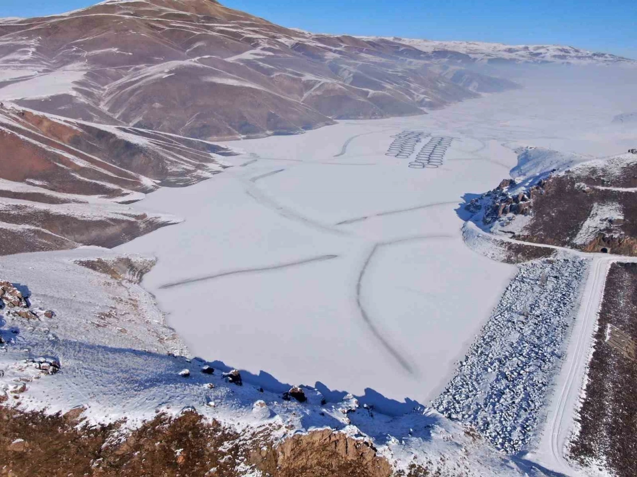 Van’da etkili olan Sibirya soğuklardan dolayı Sarımehmet Barajı’nın yüzeyi dondu.