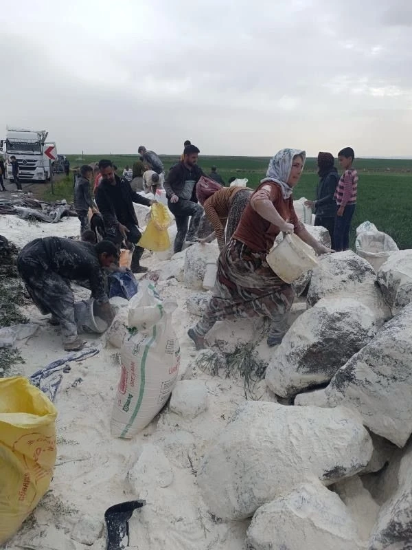 Şanlıurfa’nın Siverek ilçesinde un yüklü bir tırın devrilmesi sonucu çevreye saçılan unları, yoldan geçen sürücüler ile köylüler topladı. Olay, ilginç görüntülere sahne oldu.