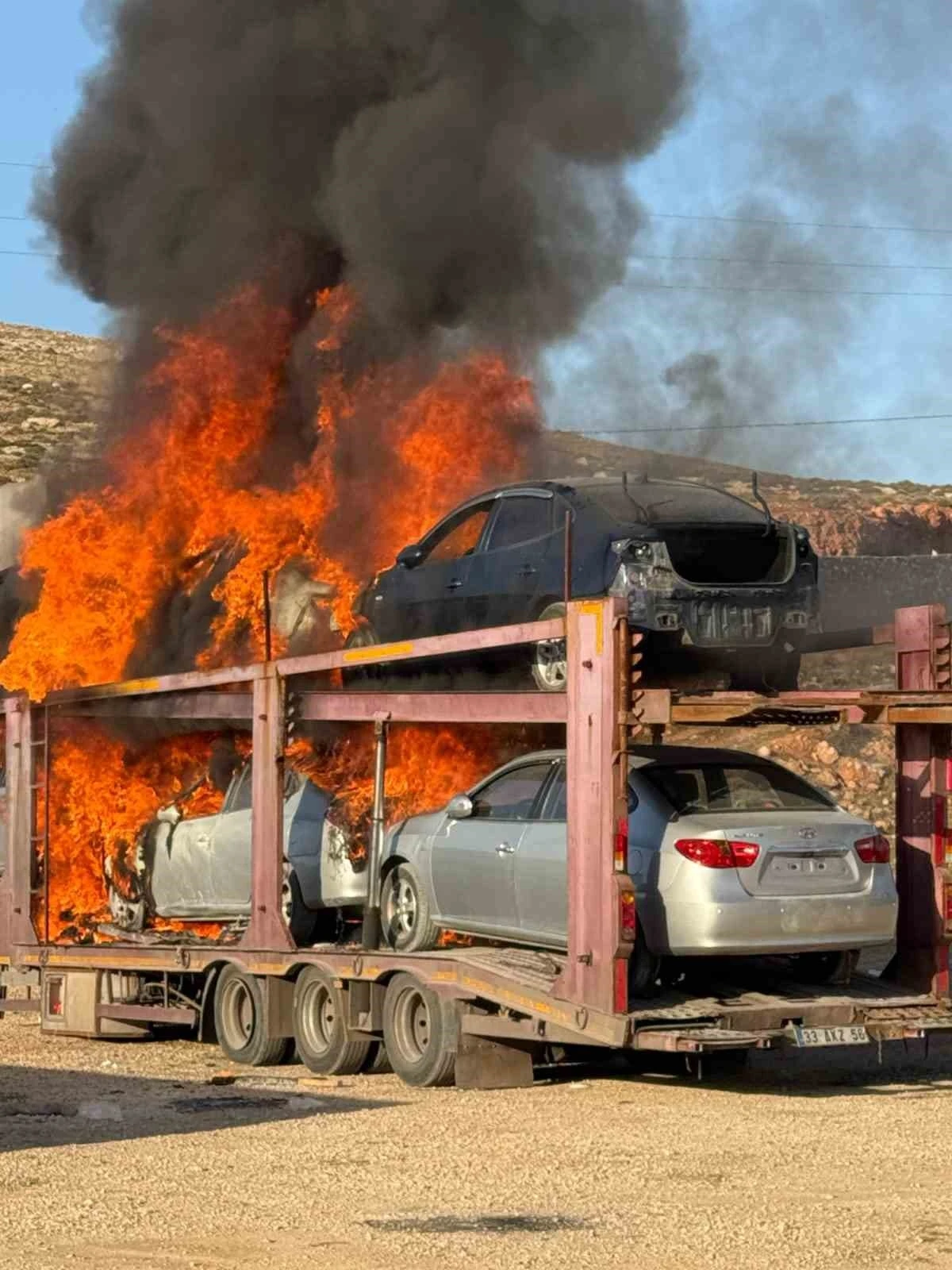 Hatay’da bulunan Cilvegözü Sınır Kapısı’ndan Suriye’ye geçmeyi bekleyen tırda yüklü araçlar alevlere teslim oldu. Yangında 6 araç yanarak kullanılamaz hale geldi.