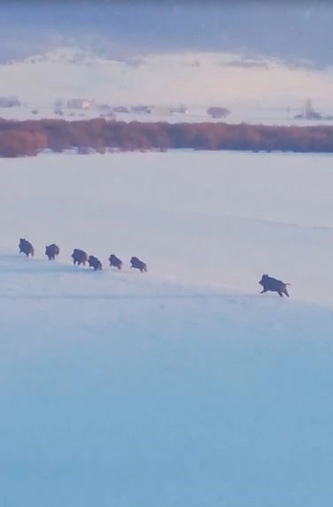 Ardahan’da zaman zaman kara yoluna kadar inen yaban domuzları bu kez karla kaplı Ardahan ovasında ormanlık alana giderken sürü halinde görüntülendi. Ardahan merkeze bağlı Edegül ve Dedegül köyleri arasında bulunan karla kaplı arazide ilerleyen domuzlar, yoldan geçen vatandaşlarca cep telefonu kamerasıyla görüntülendi.