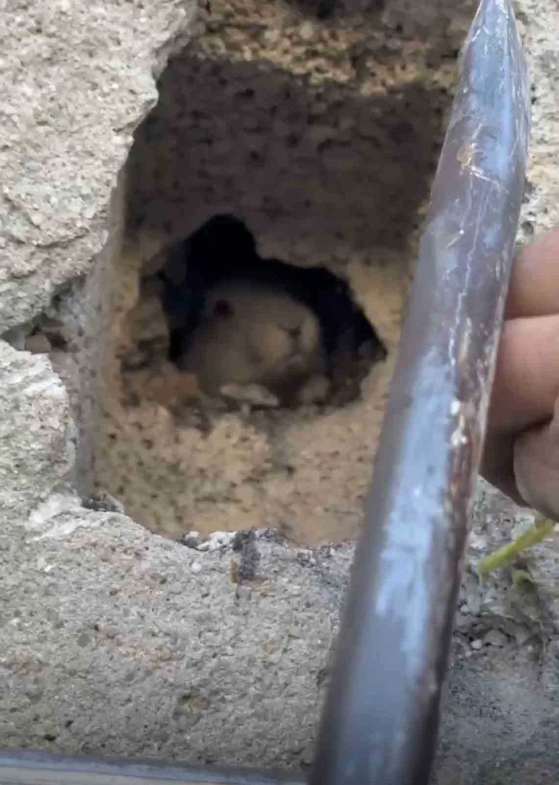 Evin dış kısmından çalışma başlatan itfaiye ekipleri, merdivenle tavşanın bulunduğu noktaya kadar çıkarak, delici iş makinası vasıtasıyla duvarı dikkatli bir şekilde delerek, koridor oluşturup, tavşanı çıkarttı.