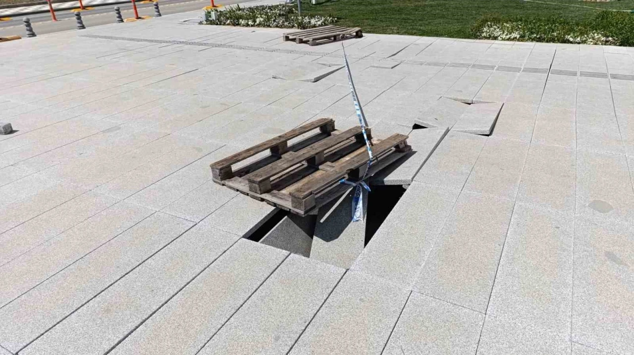 Tekirdağ Büyükşehir Belediyesi’nin milyonlarca lira harcanarak inşa edilen binasındaki beton parkeler kırıldı. Kırık alanlar tahta paletlerle kapatılmak zorunda kaldı ancak bu geçici çözüm, yayalar için büyük bir tehlike oluşturuyor