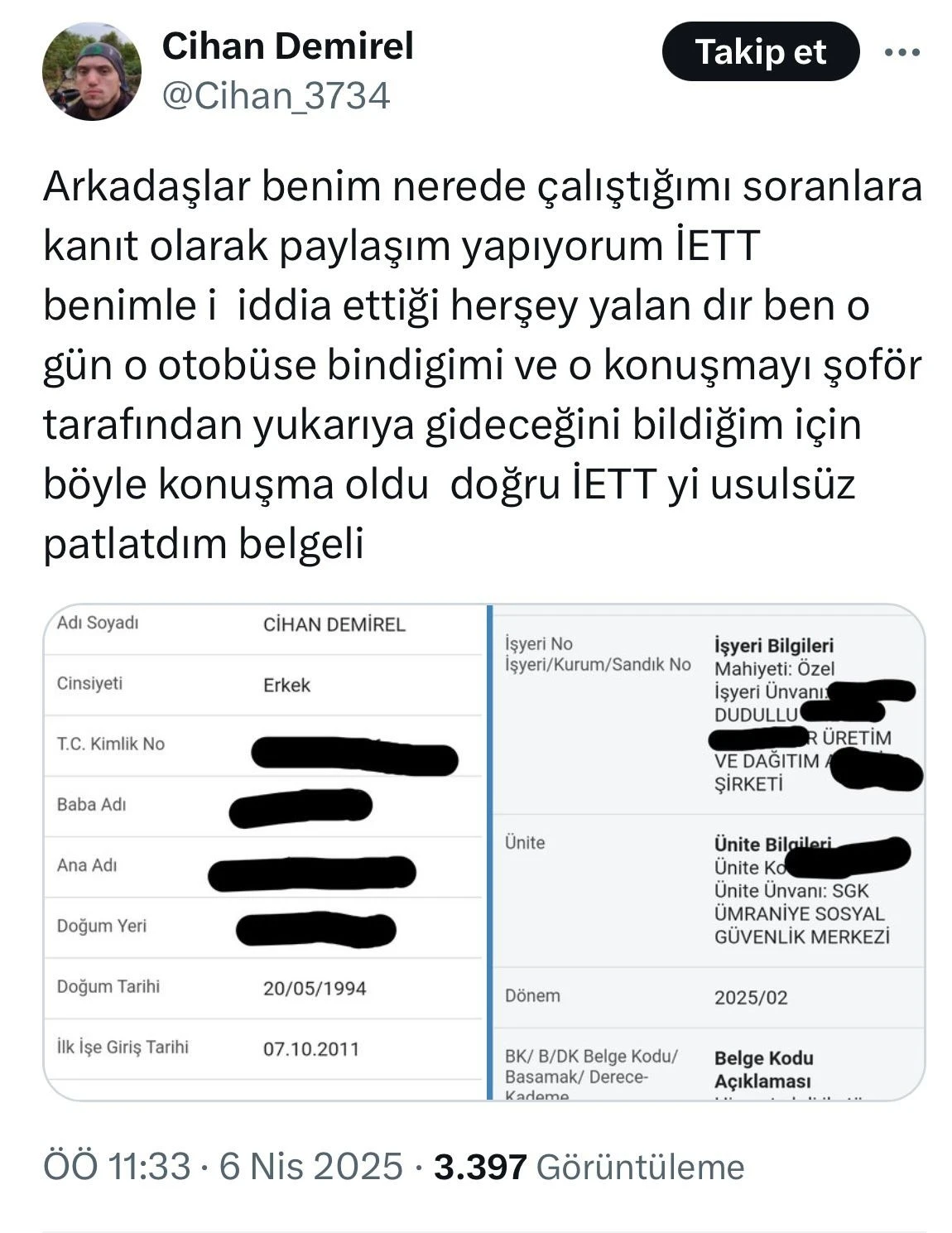 Cihan Demirel ayrıca özel bir şirkette satış temsilcisi olarak çalıştığını gösteren SGK 4A Hizmet Dökümü’nü X hesabından paylaşarak Ulaştırma Bakanlığında çalışmadığını doğruladı.