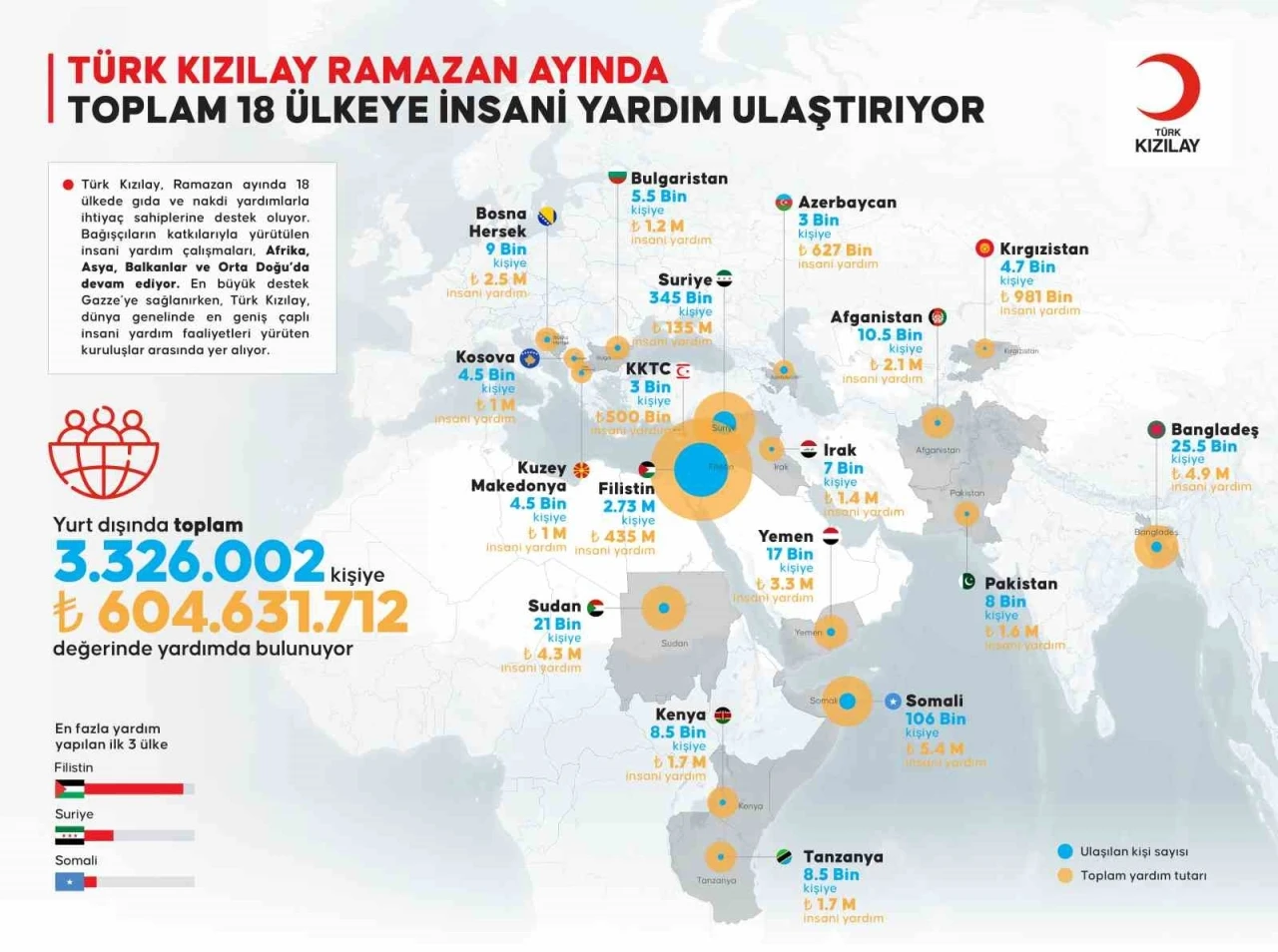 Uluslararası Kızılhaç ve Kızılay Federasyonu raporuna göre, Türk Kızılay küresel Kızılhaç-Kızılay ağı içinde en fazla ülkeye yardım ulaştıran ve en çok kişiye destek sağlayan kuruluş konumunda.