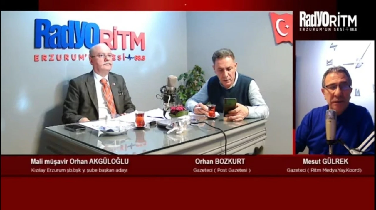Geçtiğimiz günlerde Radyo Ritm’de yayınlanan Sesli Gazete programına konuk olan Akgüloğlu, projelerini ve vizyonunu anlattı. Programda Erzurum’da daha önce Kızılay Şube Başkanlığı yapmış olan merhum Mitat Turgutcan’ı rahmetle anan Akgüloğlu, başkanlık görevi kendisine tevdi edildiği takdirde hayata geçirmeyi planladığı projeleri paylaştı.
