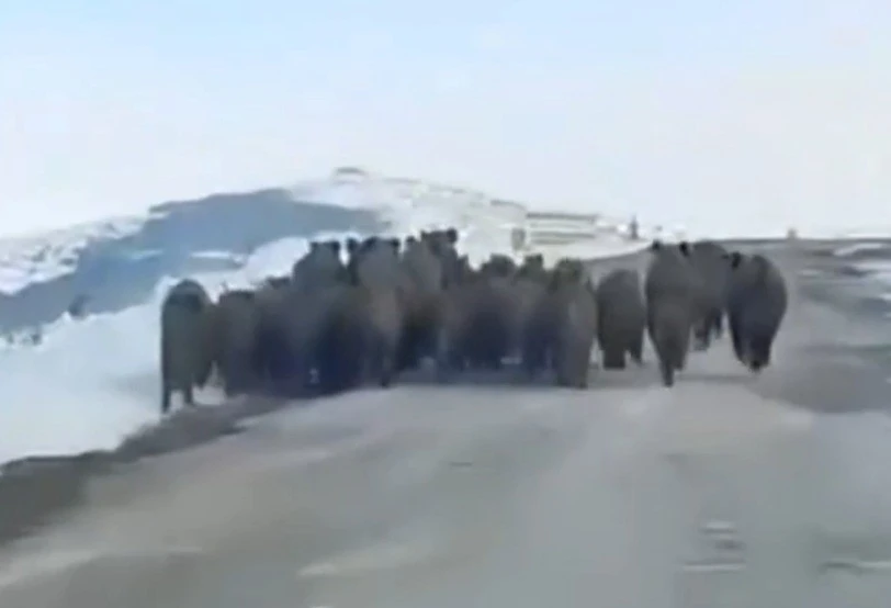 Yozgat’ın Sarıkaya ilçesi ile Çayıralan’a bağlı Elçi köyü arasındaki karla kaplı araziden yola çıkan, yaklaşık 30 yaban domuzundan oluşan dev bir sürü cep telefonu kamerasına yansıdı.