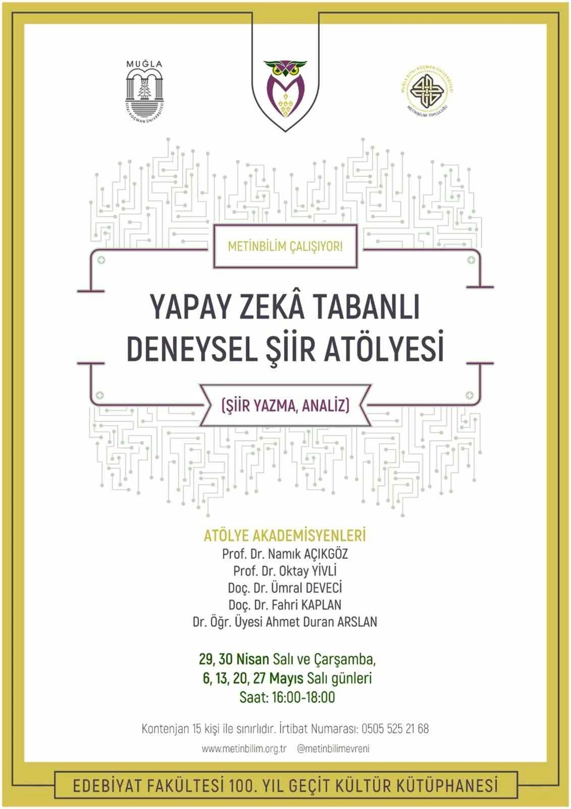 Konuyla ilgili bilgiler veren Metinbilim Enstitüsü Derneği Başkanı Doç. Dr. Ümral Deveci, "Yapay zekâ, kaçınılmaz bir şekilde hayatımızın bir parçası olmakta. Her gün pek çok yerde karşımıza çıkan yapay zekânın edebiyat alanında ve çok özel bir duygusal kurgu olan şiir alanında nasıl kullanılabileceğinin temellerini oluşturmak istiyoruz. Amacımız, binlerce yıllık duygu geleneği ve kelime dağarcığının mirası olan şiiri mekanikleştirmek değil; çok iddialı olan yapay zekâ ile bazı spesifik alanlarda neler yapılıp yapılamayacağının gösterilmesidir. Artık günlük hayatımızı organize edecek kadar güçlü olan ve gelecekte çok daha etkili programların çıkacağı bu alanda, biz edebiyatçıları bekleyen olumlulukları ve olumsuzlukları tespit etmek ve bir durum muhasebesi yapmak istiyoruz. Türkiye’de bir ilk olan bu atölyemizde oluşturacağımız görüşler, Türk şiir ve edebiyat alanına katkıda bulunacaktır. Atölyede şiir analizleri uygulaması da yapılacaktır. Böyle bir atölye ilk olduğundan çekirdek bir kadro ile çalışacak ve 15 kişilik bir öğrenci grubuyla sürdüreceğiz. Atölyemizde Prof. Dr. Namık Açıkgöz, Prof. Dr. Oktay Yivli, Doç. Dr. Ümral Deveci, Doç. Dr. Fahri Kaplan ve Dr. Öğretim Üyesi Ahmet Duran Arslan ders verip tartışmaları yönetecek" dedi.