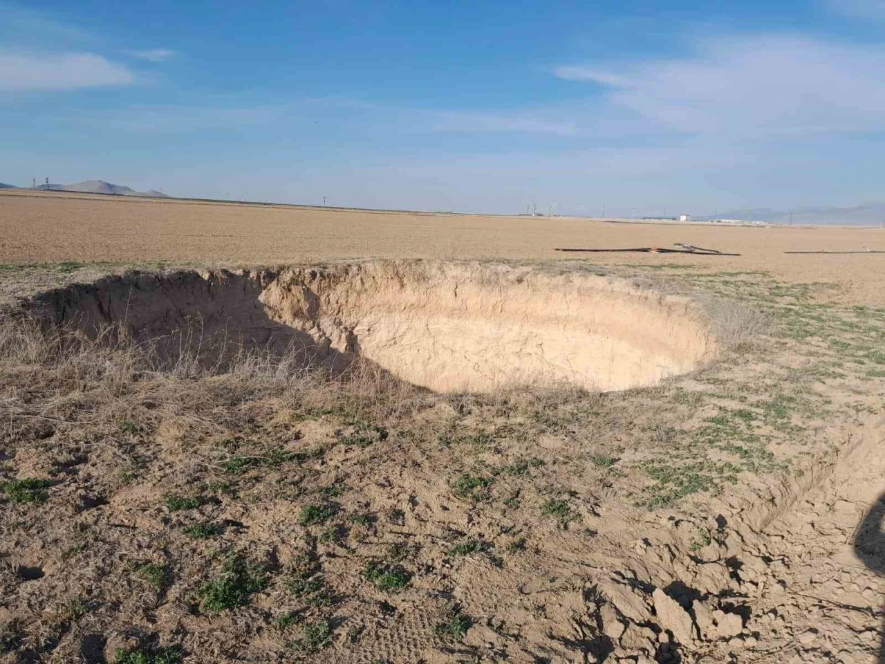 Karapınar ilçesi Apak mevkiinde Ahmet Boztaş’a ait 220 dekar tarlada 6 yıl önce oluşan obruk, toprakla doldurularak ekime devam edildi. Ancak geçtiğimiz günlerde tarla sahipleri, aynı noktada yeniden çökme meydana geldiğini fark etti. Tarlada herhangi bir sorun görülmeden uzun yıllar ekim yapılmasına rağmen, son dönemde yaşanan çöküntü tedirginlik oluşturdu. Çiftçiler, çöküntünün yaklaşık 15 gün önce meydana geldiğini tahmin ediyor.