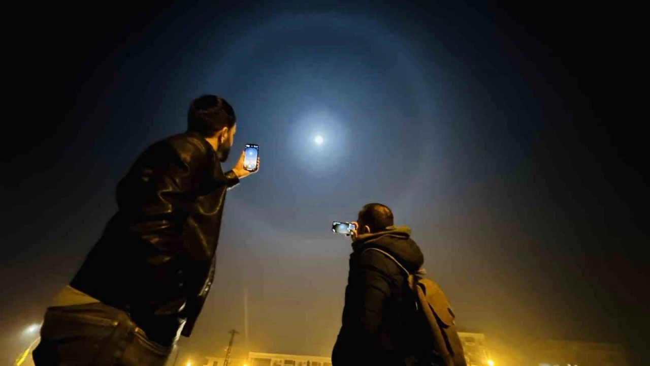 Hakkari’nin Yüksekova ilçesinde ayın etrafında nadir görülen hale oluştu. Vatandaşlar telefonlarına sarılarak o anları kayıt altına aldı.