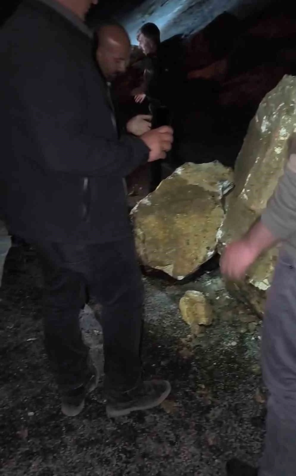 Yüksekova-Van Karayolu’nda bulunan Suüstü köyünün yakınlarında dağdan kopan kaya parçaları yolun ortasına düştü. Vatandaşlar, kendi imkanlarıyla kaya parçalarını yoldan kaldırdı.
