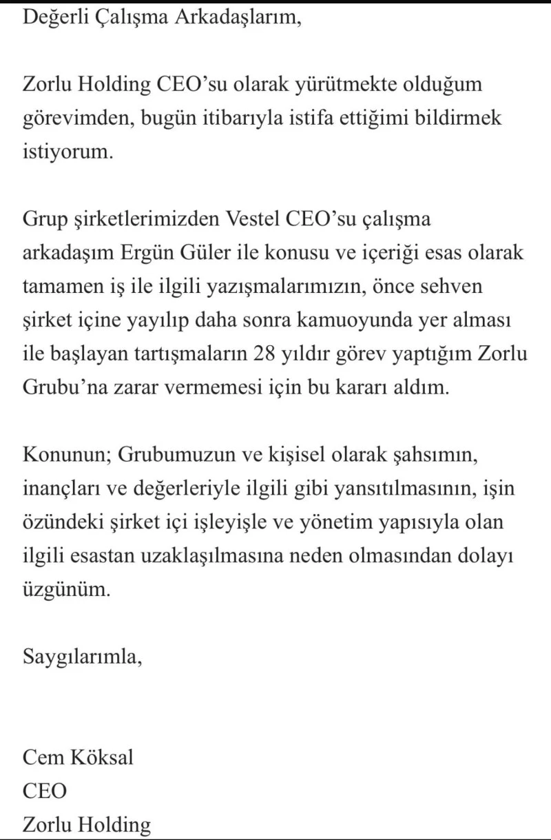 Köksal, çalışanlara gönderdiği mesajda, 28 yıldır görev yaptığı Zorlu Grubu’na zarar vermemek için bu kararı aldığını ifade etti.