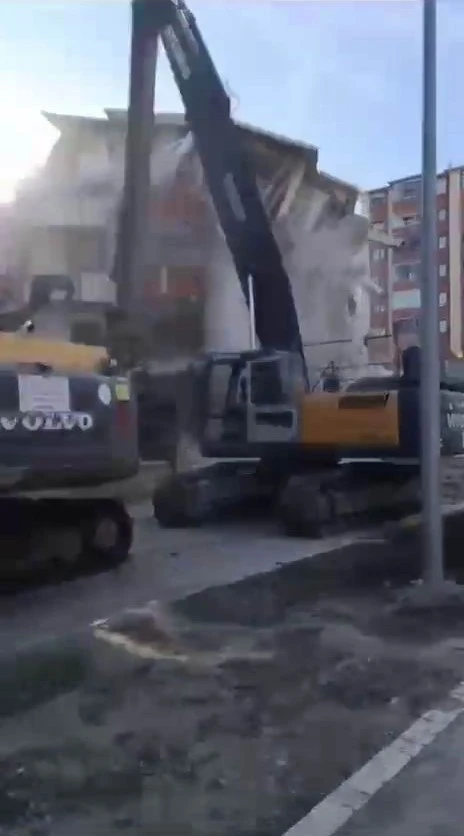 Elazığ’da ağır hasarlı 5 katlı bina, kepçenin tek dokunuşu ile yerle bir oldu. Kepçe operatörü, taş parçalarından araçtan atlayarak kurtuldu.