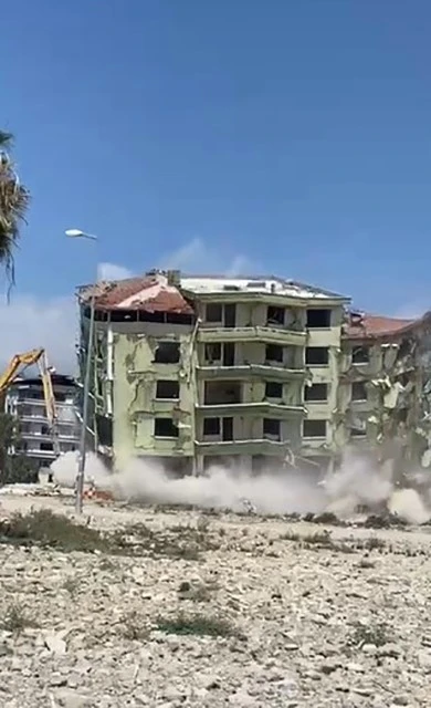 Kahramanmaraş merkezli depremlerde ağır hasar alan Hatay’da mahkeme süreci sona eren binaların yıkım ve enkaz kaldırma çalışmaları aralıksız sürüyor. Defne ilçesi Çekmece Mahallesi’nde bulunan 7 katlı bina, iş makinesi ile kontrollü olarak yıkıldı. Binanın yıkılma anı ise kameralara an be an yansıdı. 7 katlı binanın yıkımı esnasında herhangi bir olumsuzluk yaşanmadı.