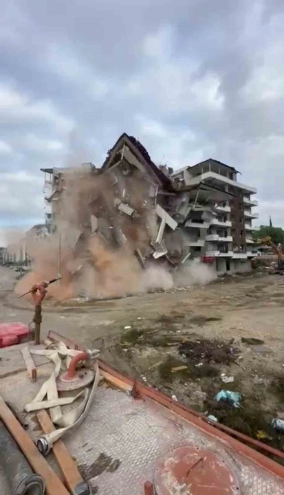 Hatay’ın Defne ilçesinde iş makinesiyle kolonlarına zarar verilen 7 katlı binanın korna sesiyle yıkıldığı anlar kameraya yansıdı.