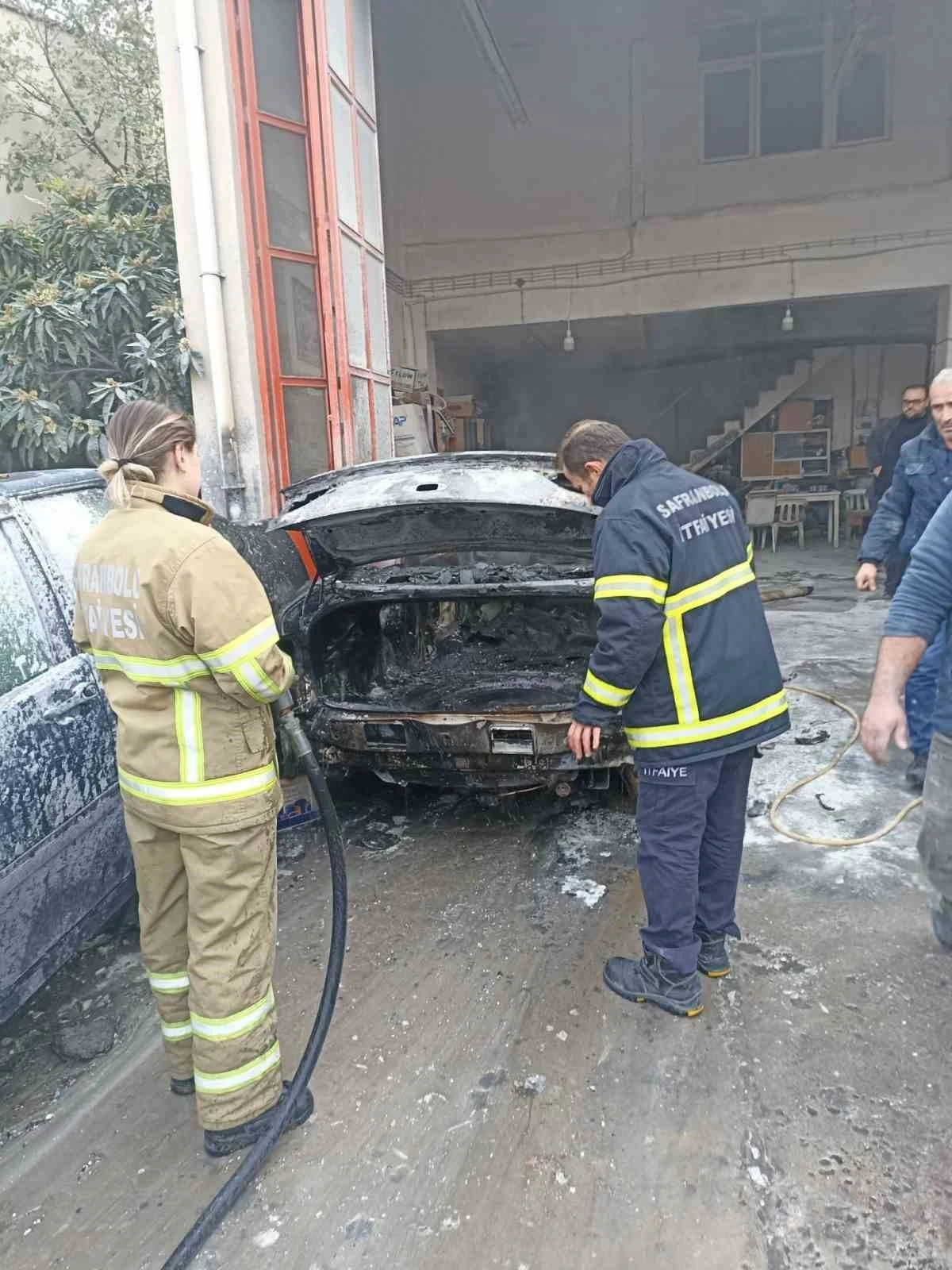 Safranbolu ilçesine bağlı Karıt Sanayi Sitesi’ndeki bir kaporta dükkanının önünde park halindeki çekme belgeli otomobilde henüz belirlenemeyen nedenle yangın çıktı. Kısa sürede büyüyen alevler tüm aracı sararken durumun bildirilmesi üzerine olay yerine gelen Safranbolu Belediyesi itfaiye ekipleri sevk edildi. Ekiplerin kısa sürede müdahalesiyle yangın kontrol altına alınarak söndürüldü. Otomobilin yakınındaki 78 AAR 339 plakalı aracın da hasar gördüğü öğrenildi.