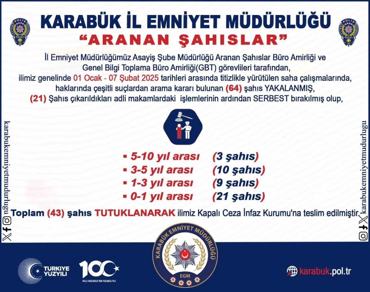 Karabük İl Emniyet Müdürlüğü Asayiş Şube Müdürlüğü Aranan Şahıslar Büro Amirliği ve Genel Bilgi Toplama Büro Amirliği (GBT) ekipleri tarafından il genelinde 1 Ocak - 7 Şubat tarihleri arasında yapılan saha çalışmalarında, haklarında çeşitli suçlardan aramaları bulunan 64 şahıs yakalandı. Yakalanan şahıslardan 21’i tamamlanan işlemlerinin ardından serbest bırakıldı. 0-1 yıl arası aranması olan 21 şahıs, 1-3 yıl arası 9 şahıs, 3-5 yıl arası aranması olan 10 şahıs, 5-10 yıl arası aranması olan 3 şahıs olmak üzere toplam 43 şahıs tamamlanan işlemlerinin ardından tutuklanarak Karabük Ceza İnfaz Kurumuna teslim edildi.