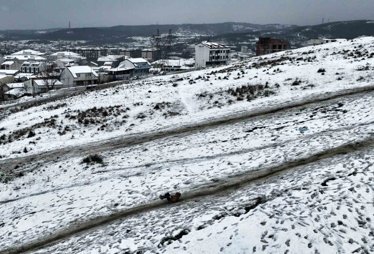Arnavutköy’de çocuklar karın tadını yokuştan poşetlerle kayarak ve kar topu oynayarak çıkardı. Çocukların doyasıya eğlendiği ve kar sevincini yaşadığı anlar havadan görüntülendi.