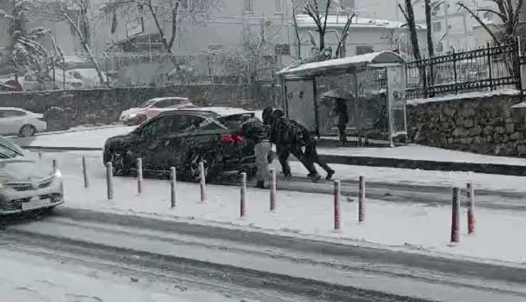 İstanbul Arnavutköy’de kar nedeniyle araçlar yolda kaldı. Vatandaşlar karda hareket edemeyen bir otomobili el birliğiyle kurtarmaya çalıştı. O anlar cep telefonu kamerasına yansıdı.