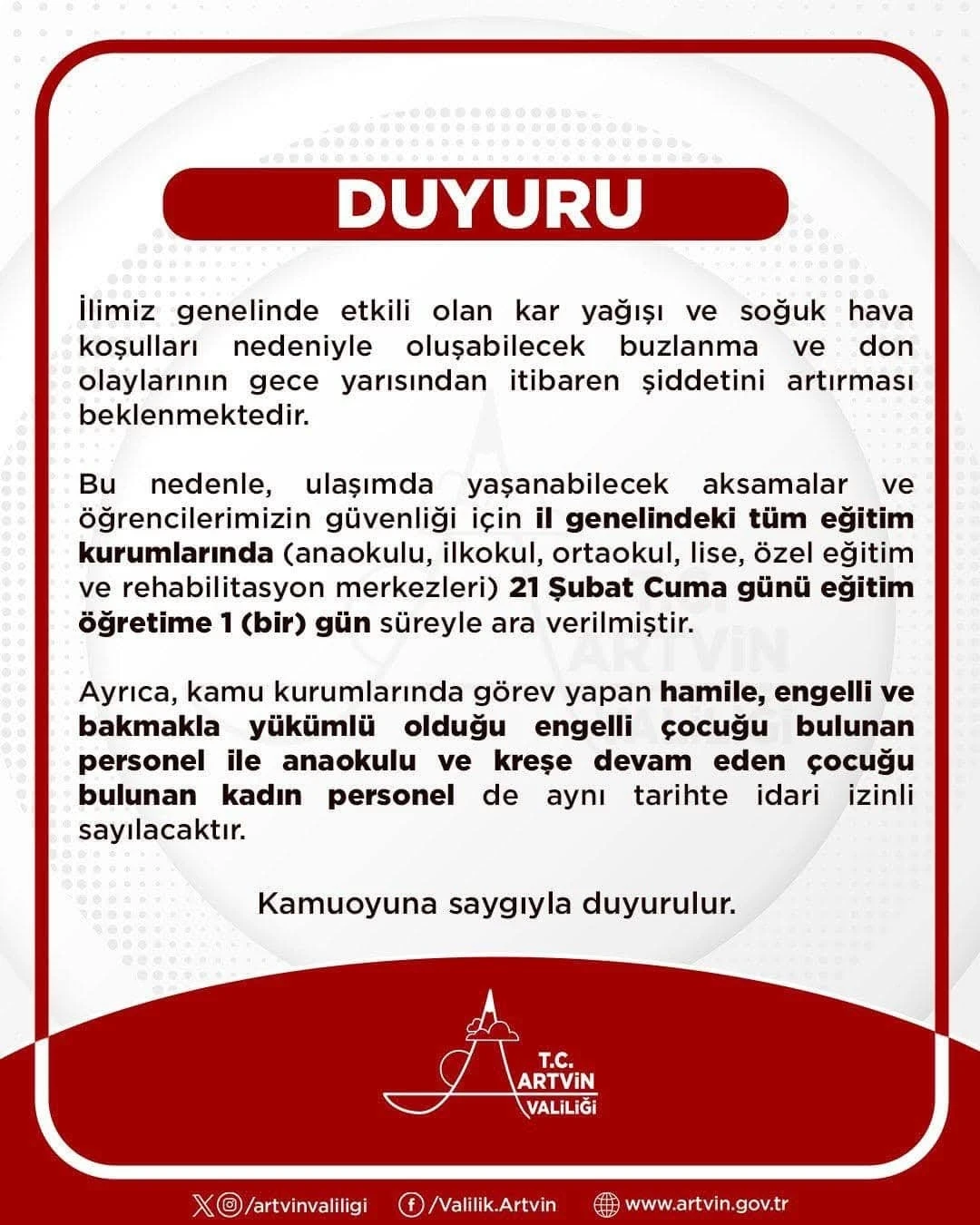Artvin Valiliğinden yapılan açıklamada, il genelinde etkili olan kar yağışı ile birlikte oluşabilecek don ve buzlanmanın gece yarısından itibaren şiddetini artırmasının beklendiği ifade edilerek, "Öğrencilerimizin güvenliği için il genelindeki tüm eğitim kurumlarında (anaokulu, ilkokul, ortaokul, lise, özel eğitim ve rehabilitasyon merkezleri) 21 Şubat Cuma günü eğitim öğretime 1 gün süreyle ara verilmiştir" ifadeleri kullanıldı.