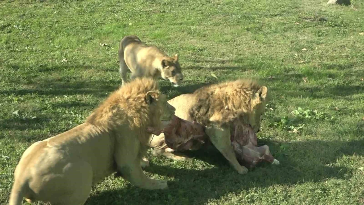 Bursa Hayvanat Bahçesi’ndeki hayvanların hareketlenmesi için farklı yöntemlerle yapılan besleme egzersizleri nefesleri kesti. Bulundukları barınaklarından çıkan aslanlar, karkas olarak bırakılan yaklaşık 50 kiloluk eti kısa sürede parçaladı.