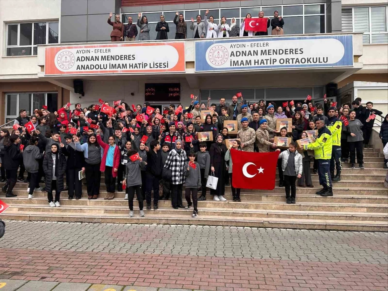 Efeler Adnan Menderes Anadolu İmam Hatip Lisesi öğrencileri, öğretmenleri ve velileri tarafından örnek bir sosyal sorumluluk projesi gerçekleştirildi. "Atkılar Takılsın Mehmed’im Isınsın" projesi kapsamında öğretmen, öğrenci ve veliler, Suriye Görev Gücü’nde görev yapan Mehmetçik için atkı ördü. Cumhuriyetin 101. yılı dolayısıyla 101 adet atkı ören gençler, hazırladıkları atkıları okul yönetimi ve öğretmenleriyle birlikte Aydın İl Jandarma Komutanlığı’na teslim etti. Ayrıca gerçekleştirilen teslim etkinliğinde öğrencilere jandarmanın tanıtımı yapılırken, öğrenciler Aydın Jandarma Filo Komutanlığı’nda misafir edildi. Öğrencilerin örnek davranışı takdir toplarken, etkinlik sonunda öğrencilere Türk bayrağı ve jandarma şapkası hediye edildi.