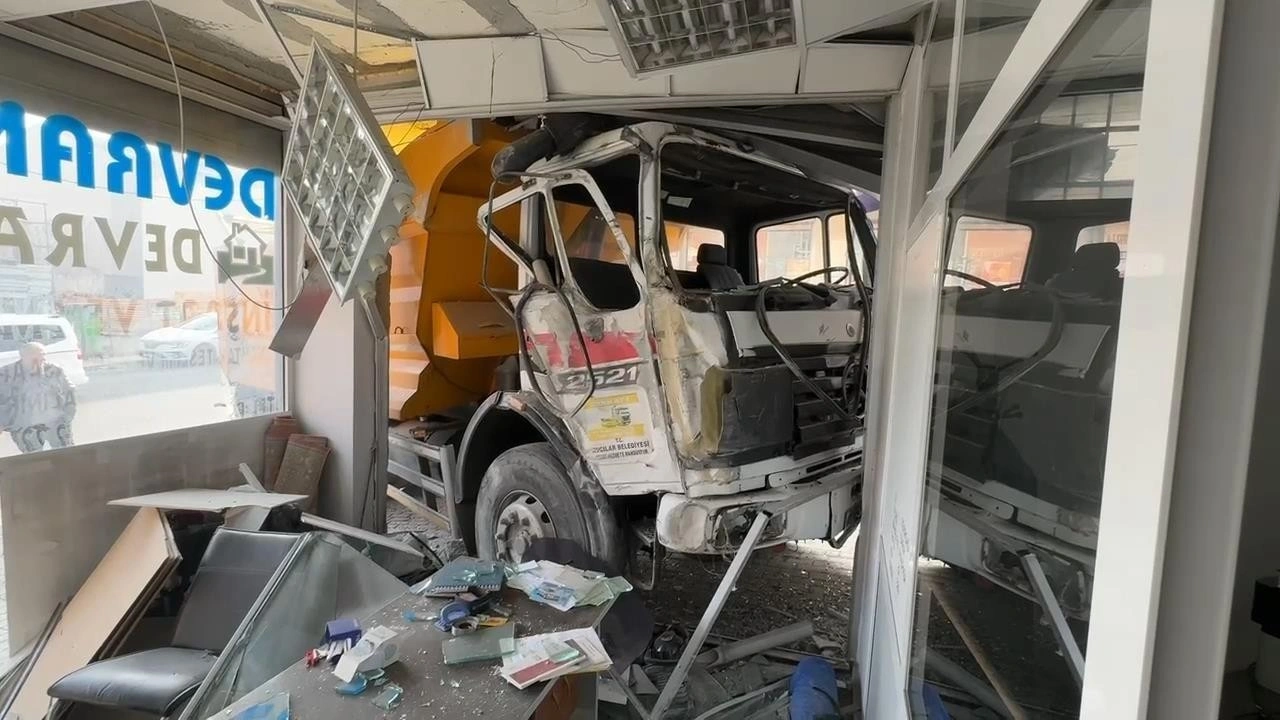 Önce park halindeki 34 RC 0468 plakalı cipe çarpan kamyon, ardından emlak ofisinin duvarını yıktı. Kazada, kamyonun bir kısmı yıkılan duvardan emlak ofisine girdi.