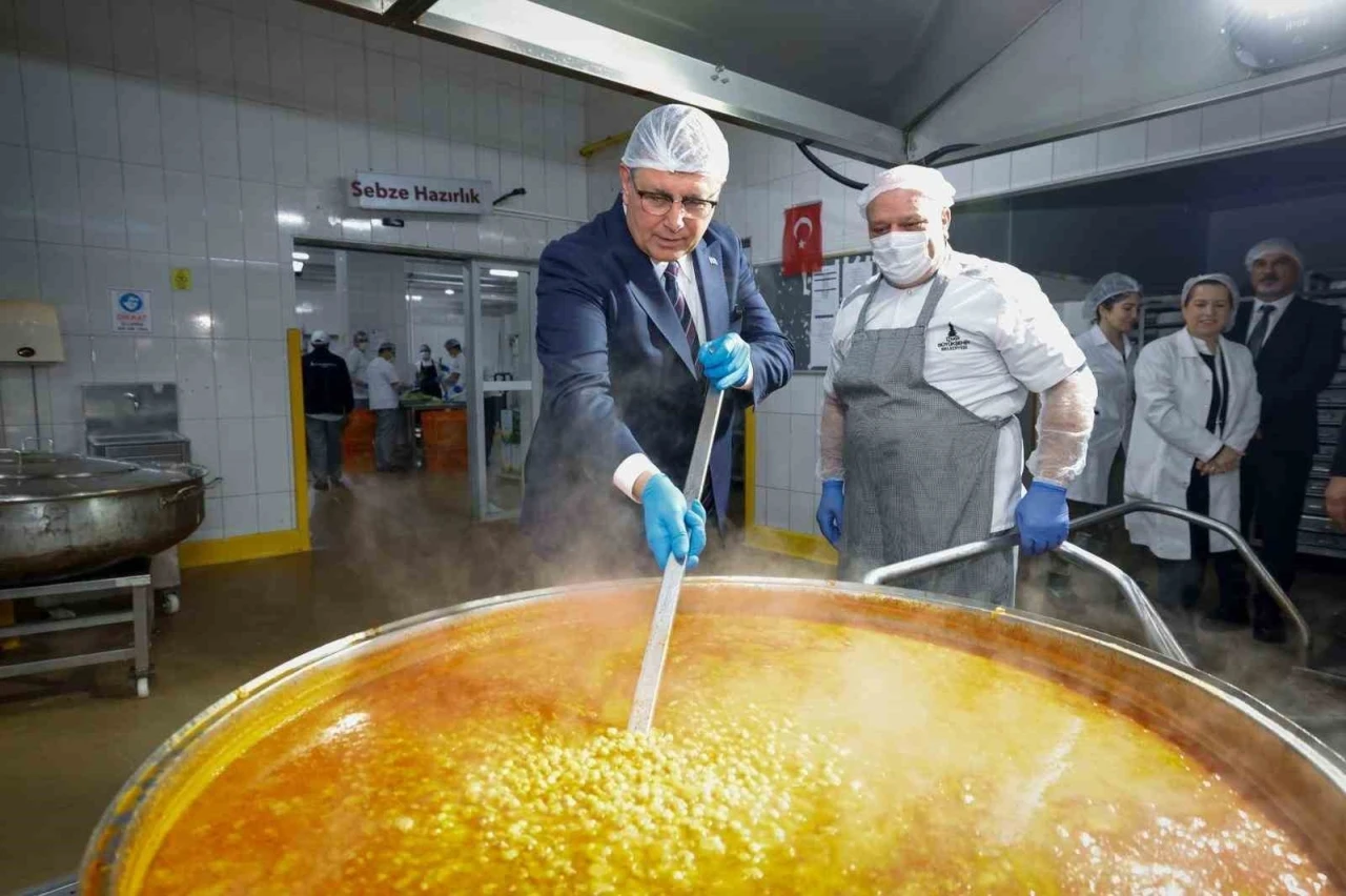 İzmir Büyükşehir Belediye Başkanı Dr. Cemil Tugay, tencerelerin ihtiyaç sahibi yurttaşlar ve iftar sofraları için kaynadığı İzmir Büyükşehir Belediyesi Aşevi’ni ziyaret etti. Günde 30 bin kişilik yemek üreten aşevinde özveriyle çalışan personele teşekkür eden Başkan Tugay eline kepçeyi alarak yemek hazırlığına katıldı.