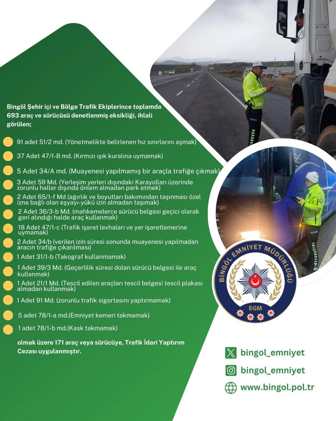 Bingöl İl Emniyet Müdürlüğü şehiriçi ve bölge trafik ekiplerince 693 araç ve sürücü denetlendi. Denetimlerde kurallara uymayan 171 araç ve sürücüye trafik idari yaptırım cezası uygulandı. Ayrıca Narkotik Suçlarla Mücadele Şube Müdürlüğü Genç Büro Amirliği ekipleri tarafından yapılan çalışmalarda 1.36 gram top esrar maddesi ele geçirilirken 2 şüpheli hakkında adli işlem yapıldığı bildirildi.
