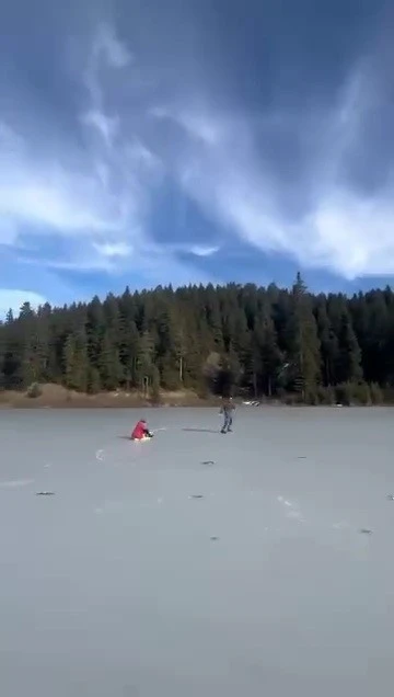 İlçeye bağlı bin 750 rakımlı Sarıçiçek Yaylası Göleti’nin yüzeyi soğuk hava nedeniyle buz tuttu. Bölgeye gelen bir aile buz tutan göletin üzerinde hem yürüdü hem de kızakla kayak keyfi yaşadı. O anlar cep telefonu kamerasıyla görüntülendi.