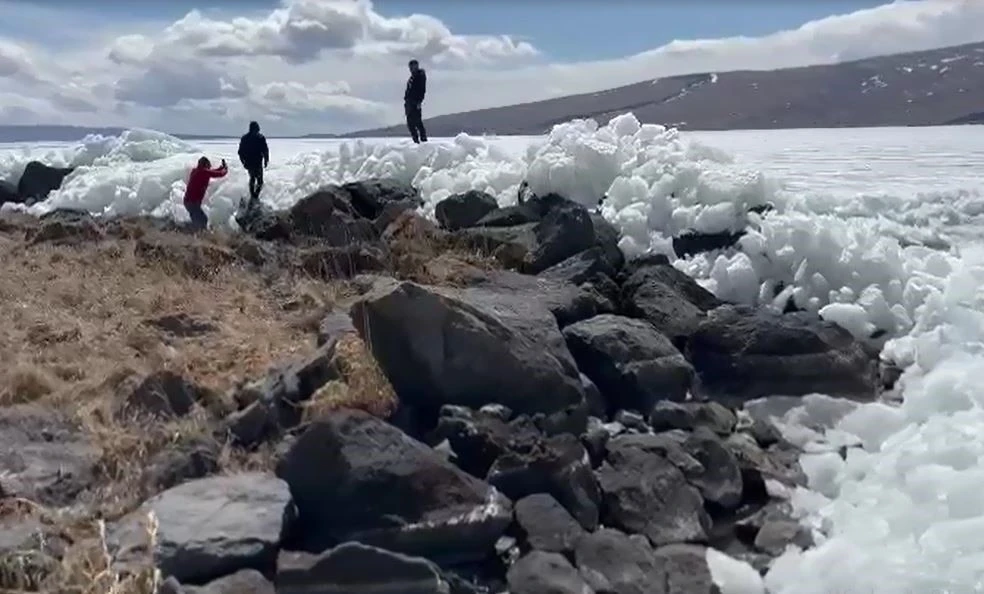 Doğu Anadolu Bölgesi’nin en büyük ikinci gölü olan Çıldır Gölü’nün kış aylarında yaklaşık 50 santimetreye ulaşan buzları havaların ısınması ve rüzgarın etkisiyle çözülmeye başladı.